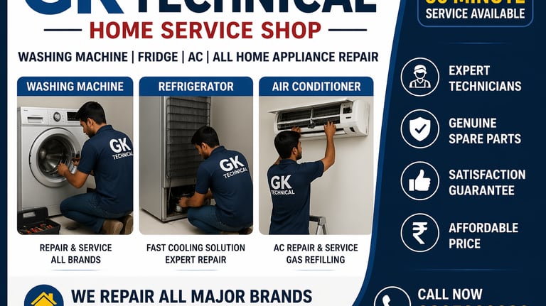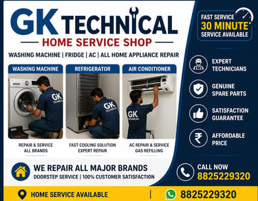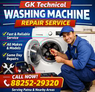 Kya aapki washing machine sahi se kaam nahi kar rahi? GK Technical lekar aaya hai fast aur reliable washing machine repair service. Hamare experienced technicians front load aur top load sabhi brands aur models ki repair karte hain.
